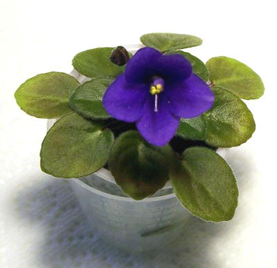 Optimara Blue Topaz (7346) 04/11/1990 (Holtkamp) Single purple-blue. Medium green, pointed, hairy, glossy. Miniature (Karen's note: leaves have red backs, petioles are red) |