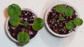 | When the plantlets are large enough to handle, remove them from the mother leaf. | Use a pencil, or slender object such as the handle of a paintbrush to "tease" them apart. | Two of the babies are potted up. Be sure not to plant them so deep as to cover the crowns (center leaves) |