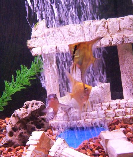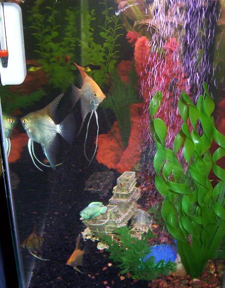 Done with his air shower "Henry" swims out with the two youngster angels near by. |