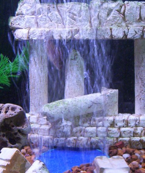 The bubble pool in front of the temple with "Henry" the Cory cat in his favorite spot, right in the middle of the bubble disk |