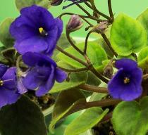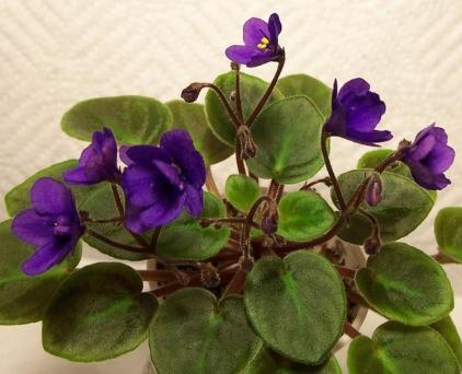 Optimara Blue Topaz (7346) 04/11/1990 (Holtkamp) Single purple-blue. Medium green, pointed, hairy, glossy. Miniature (Karen's note: leaves have red backs, petioles are red) |