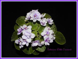 Optimara Little Diamond (6949) 11/19/1988 (Holtkamp) Semidouble white/variable blue center. Medium green, ovate, pointed, hairy, glossy, serrated. Miniature |